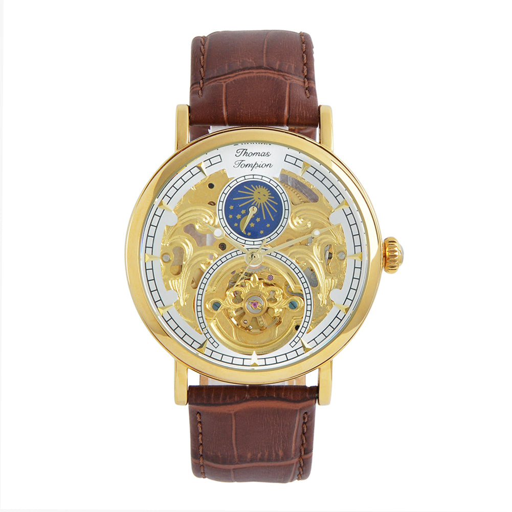 The Observatory watch's centerpiece is a stunning gold framework, inspired by Thomas Tompion’s famous “Regulator” clock. The full skeleton showcases the intricate workings of the automatic, self-winding movement. Admire the moon phase cycles displayed on the sub-dial, adding to the watch’s precision and sophistication. The soft calfskin leather strap provides comfort and style, completing this elegant and timeless timepiece.