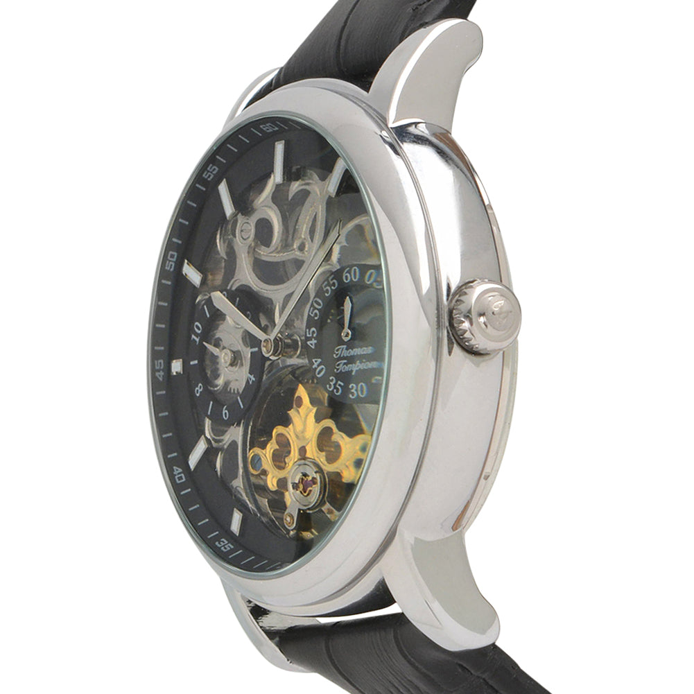 The Cambridge watch is a modern masterpiece inspired by Thomas Tompion's longcase watch. Its open heart dial reveals the intricate workings of the 22-jewel self-winding movement. With a silver case, black dial, and black leather strap, this watch offers a timeless classic look. Enjoy the precision of its moon phase cycles and dual-time functions.