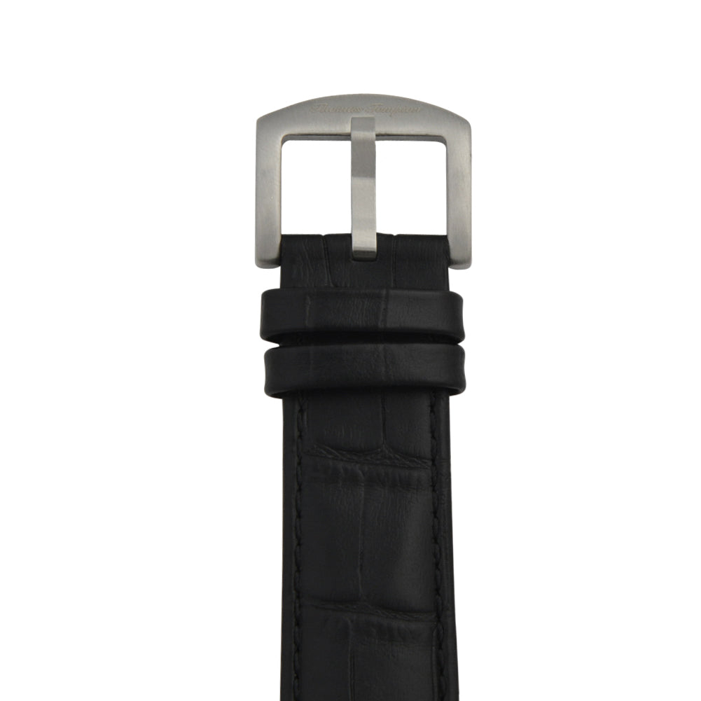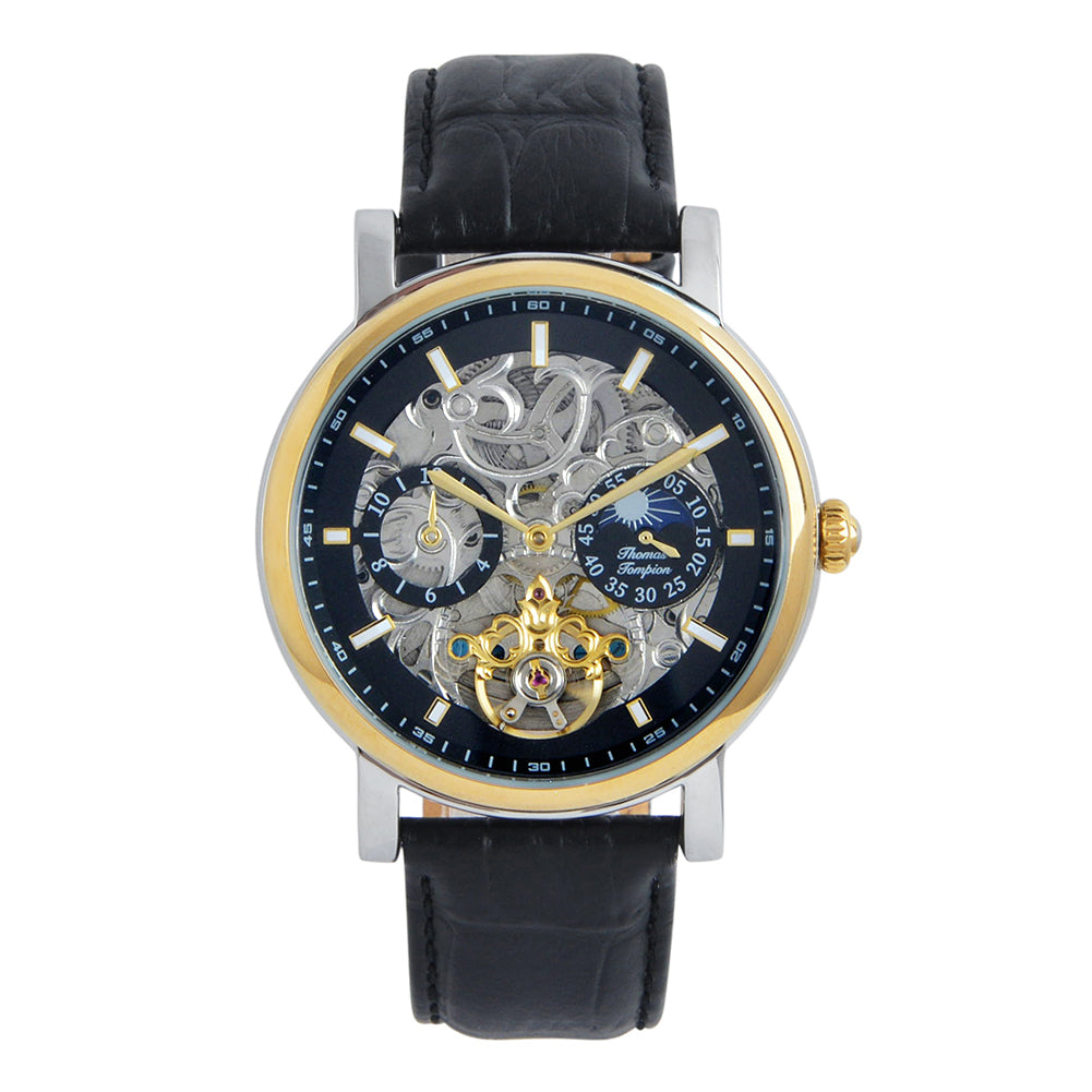 The Cambridge watch is a modern masterpiece inspired by Thomas Tompion's longcase watch. Its open heart dial reveals the intricate workings of the 22-jewel self-winding movement. With a silver and gold case, black dial, and black leather strap, this watch offers a stylish sophisticated look. Enjoy the precision of its moon phase cycles and dual-time functions.