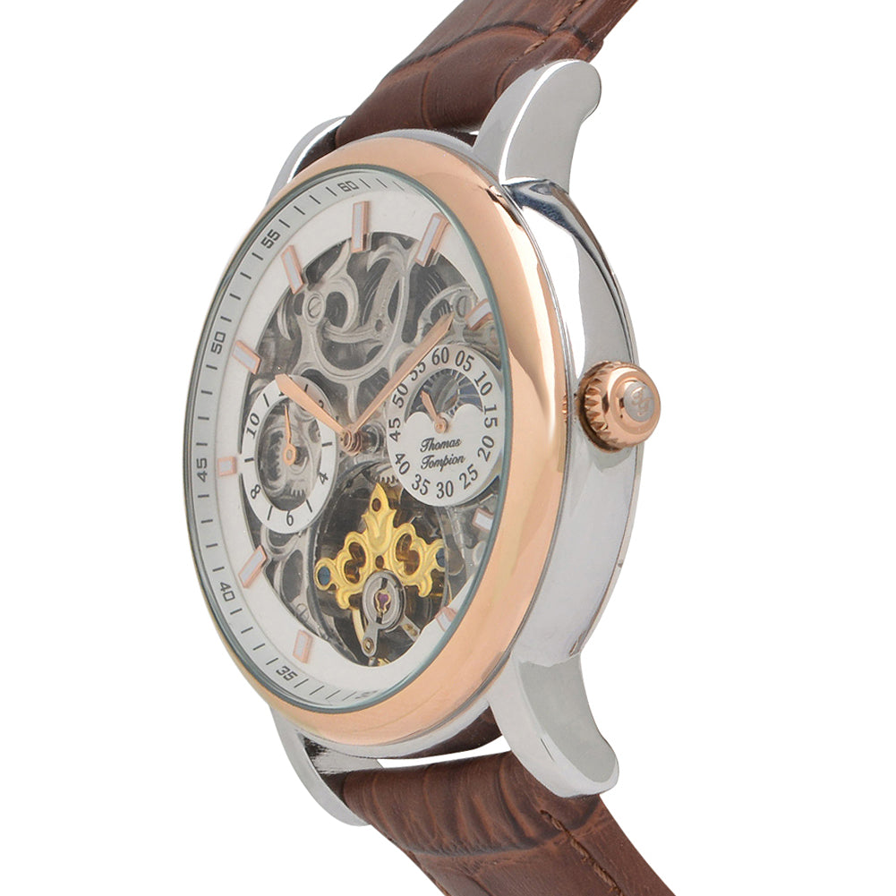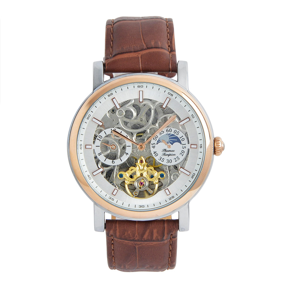 The Cambridge watch is a modern masterpiece inspired by Thomas Tompion's longcase watch. Its open heart dial reveals the intricate workings of the 22-jewel self-winding movement. With a rose gold and silver case, silver dial, and brown leather strap, this watch offers a classic sophisticated look. Enjoy the precision of its moon phase cycles and dual-time functions.