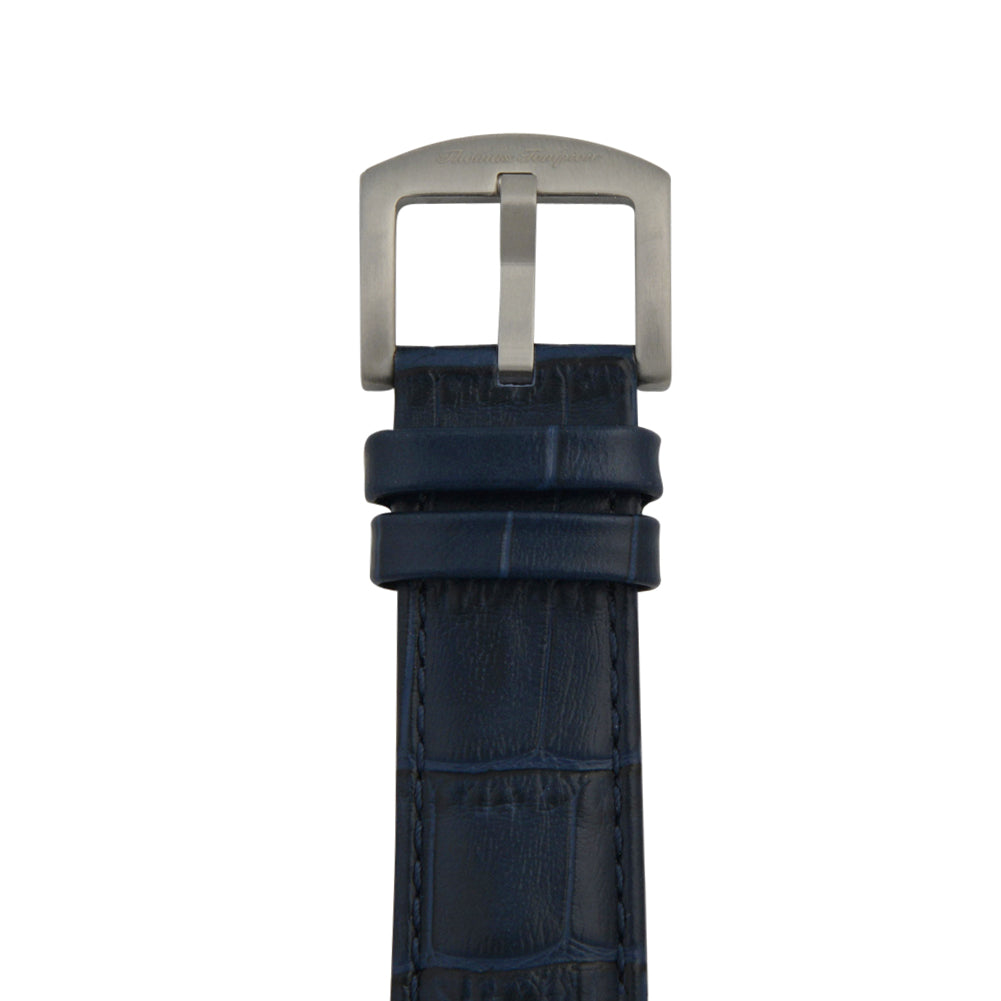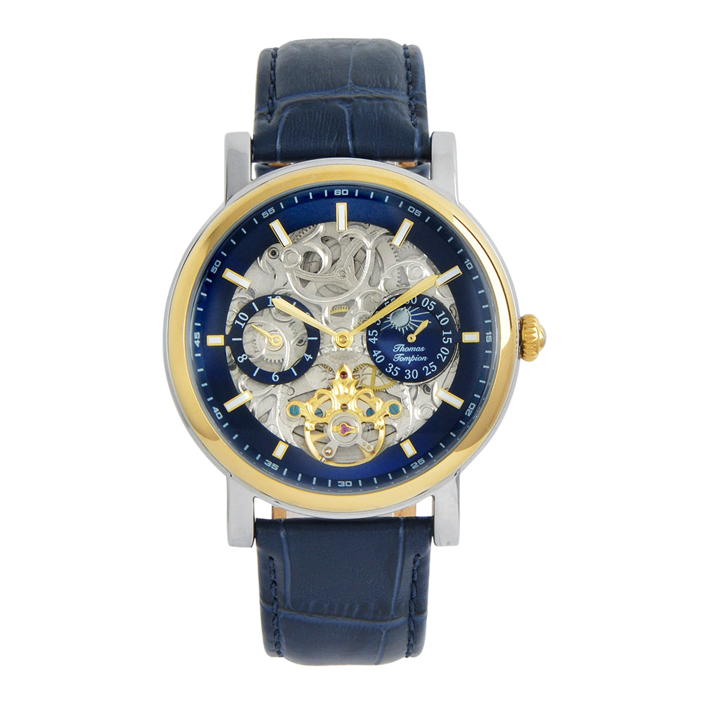 The Cambridge watch is a modern masterpiece inspired by Thomas Tompion's longcase watch. Its open heart dial reveals the intricate workings of the 22-jewel self-winding movement. With a silver and gold case, blue dial, and blue leather strap, this watch offers a unique and modern look. Enjoy the precision of its moon phase cycles and dual-time functions.