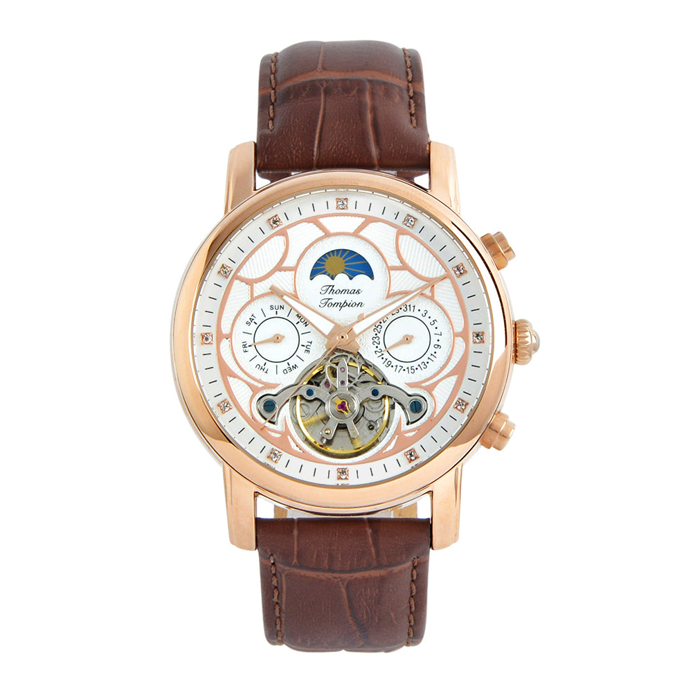 The Kew watch is a modern interpretation of Thomas Tompion's iconic designs, capturing the essence of his horological genius. It has three smaller dials that show the moon phase, day, and date. Its intricate dial features special patterns and sparkling diamonds, adding a touch of luxury and elegance. The watch has a comfortable leather strap and a 44mm case. It is a perfect blend of classic style and modern design.